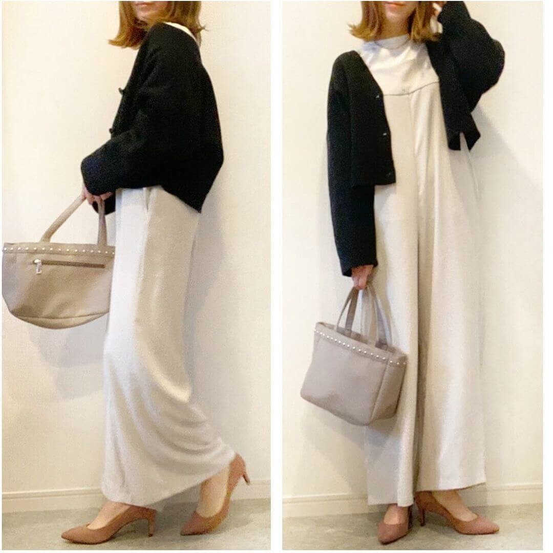 ブラックのカーディガンを羽織ってみると、色味のコントラストが付いてメリハリを演出。