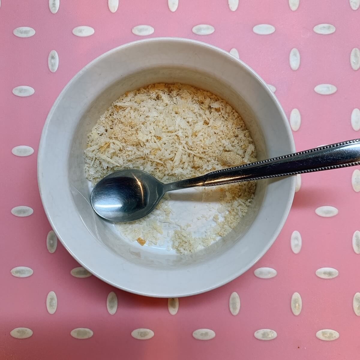 別の器に、パン粉と砂糖を入れてよく混ぜあわせておきます。あとで、焼いた食パンに振りかけます。