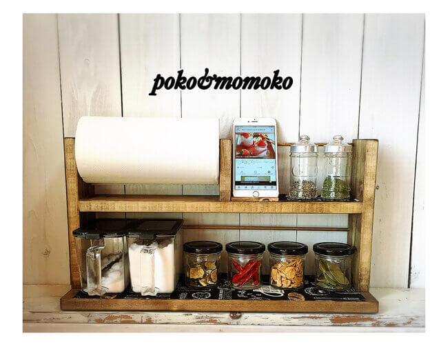 最初にご紹介するのは、砂糖や塩を入れるフタ付き調味料入れから、コショウや七味などのボトルタイプの調味料、キッチンペーパーなどキッチンには欠かせないものをすべて収納できるスパイスラックです。