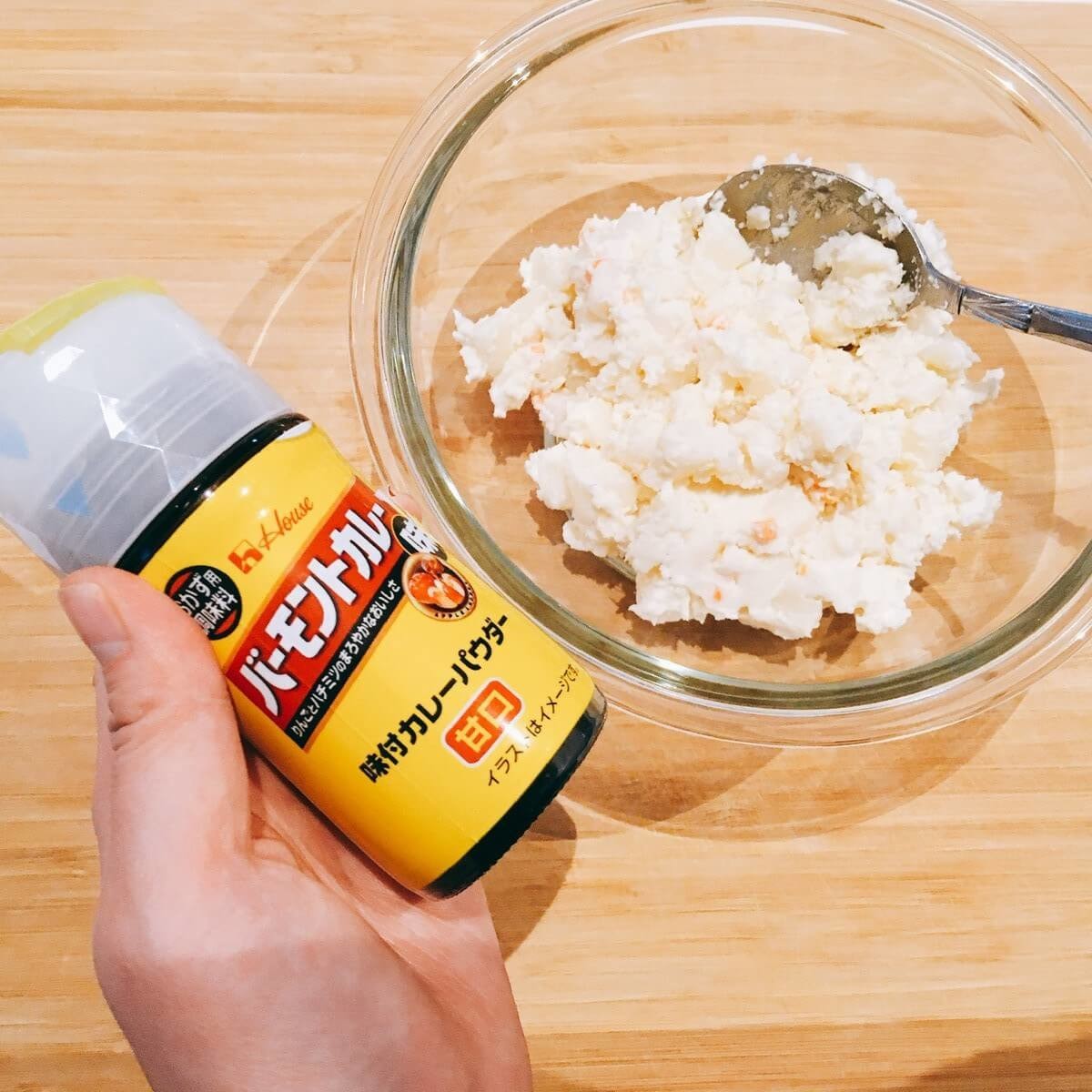 業ス―のポテサラに、カレー粉を足して混ぜ混ぜ。