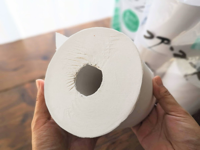また、コア・ユースはシングルの芯なしタイプのトイレットペーパーで、こちらはなんと一般的なシングルの商品約3ロール分の長さがあり、本当に交換頻度がぐんっと減ります。その上、芯を捨てる手間もなくなりますので、とにかく手間を減らしたいという方には最適です。