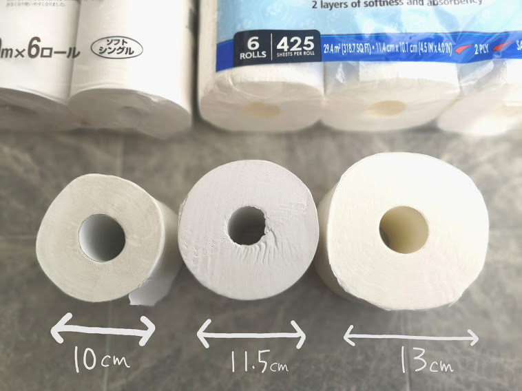 個包装のサイズが変わらないのなら、ロールの大きさも変わらないの?と思いがちなところですが、実は1ロールでは結構差があったんです。