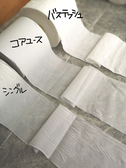 まずはロールの見た目ですが、左から、一般的なシングルトイレットペーパー、コア・ユース、バスティッシュです。