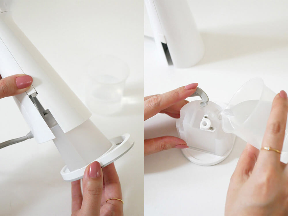 本体左右の水タンクロックボタンを押しながら、水タンクを本体から外し、付属の目盛り付き計量カップでタンクに水を入れ、本体のロックボタンがカチッと音がするまではめれば、完了。