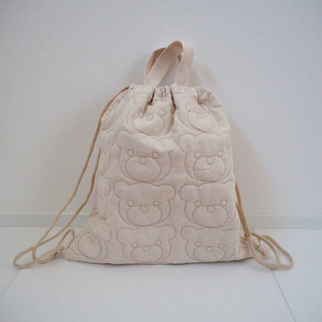 くまのキルティング生地の「キッズナップサック」は、シンプルだけど、パッと目が惹かれます。幼稚園や保育園での荷物入れや、小学校の体操着入れとしても使えます。