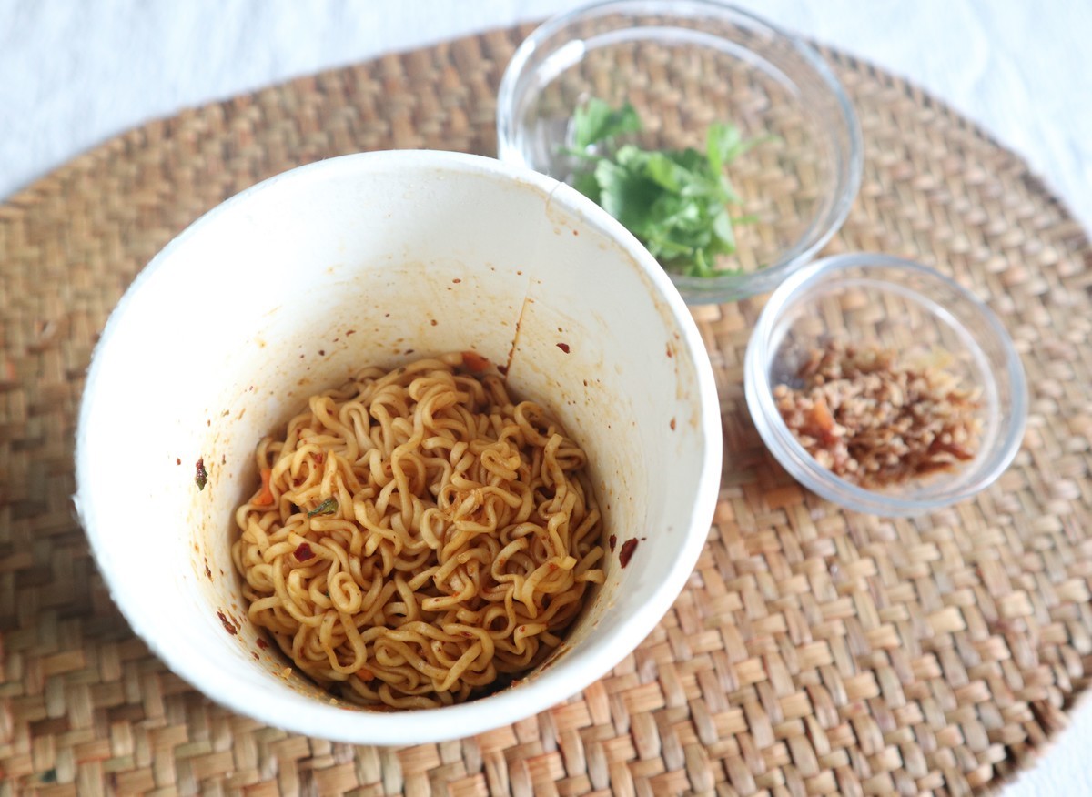 粉末スープとシーズニングオイルを入れて、お湯を注いで3分置きます。