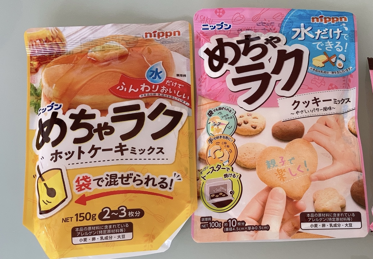こちらが私が推したいキャンドゥで買う事ができる「ニップン めちゃラク」のホットケーキミックスとクッキーミックスです。もちろん100円(税抜)!食品コーナーを眺めていた時にチラリと目に止まった「ラク」の文字、しかも良くみると「めちゃラク」!