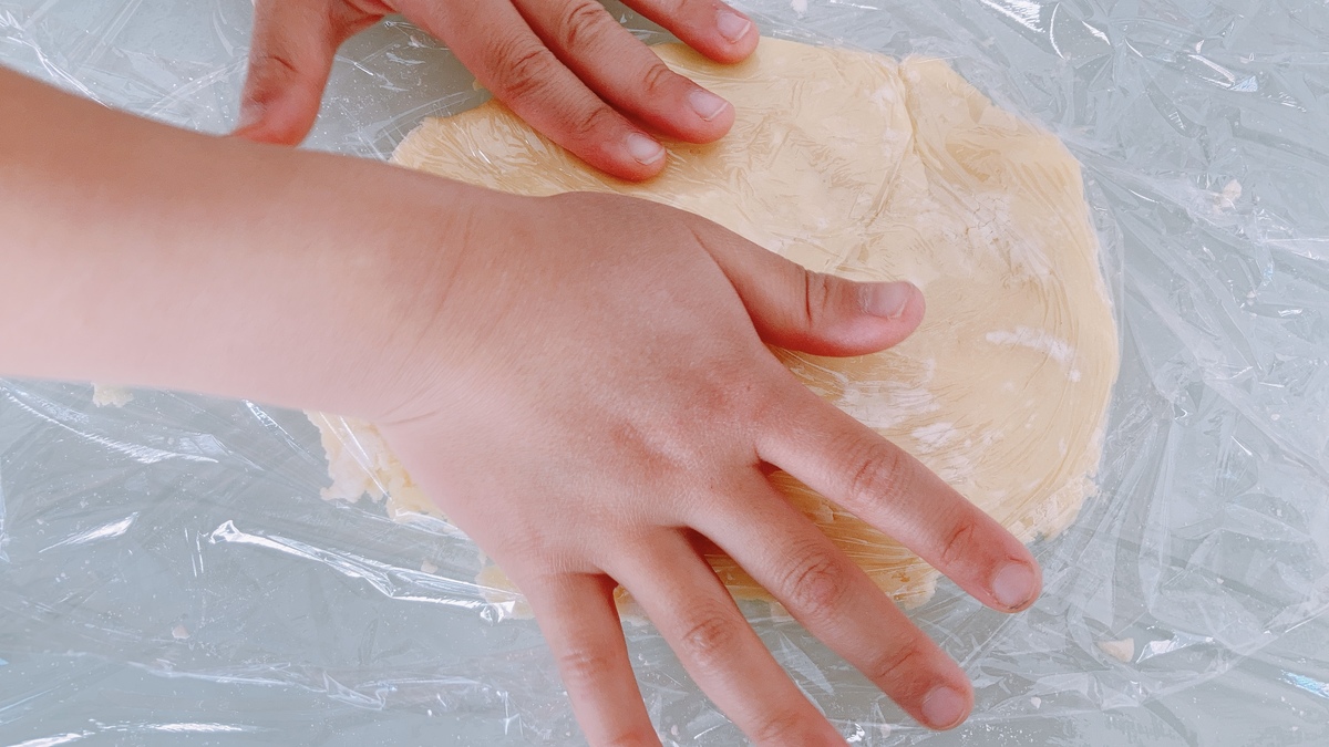 まとまったら袋から出して成形します。サランラップに出して伸ばすと手にもくっつかず表面が綺麗に仕上がりますよ。麺棒がある場合は使うと便利ですがなくても手のひらで平たく広げればOK。