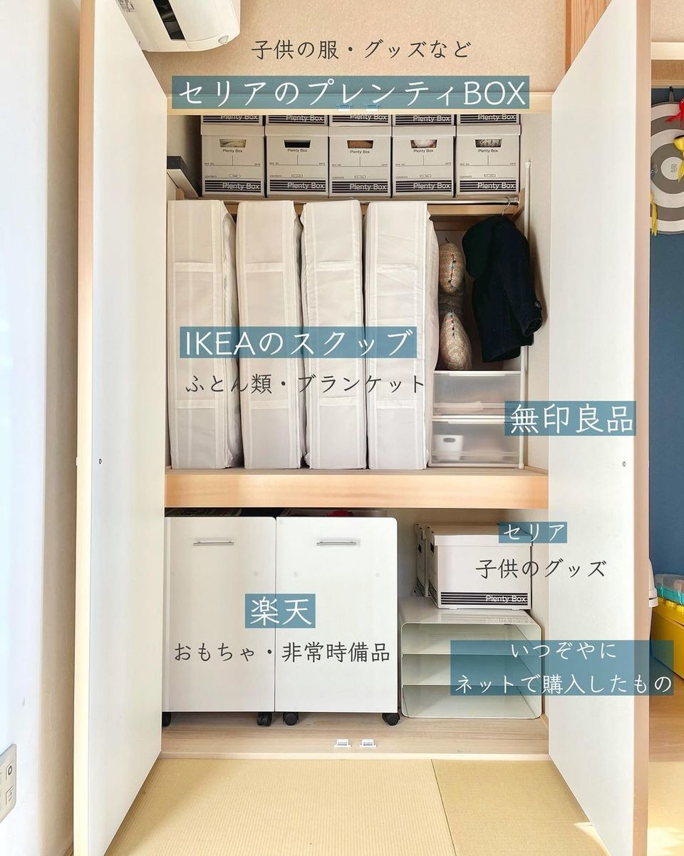 @yukinkochan_houseさんのお宅の押し入れは、押し入れの大きさに合わせてぴったりとハマる収納アイテムをチョイスしています。隅々までシンデレラフィットしていて、とっても気持ちがいいですね。