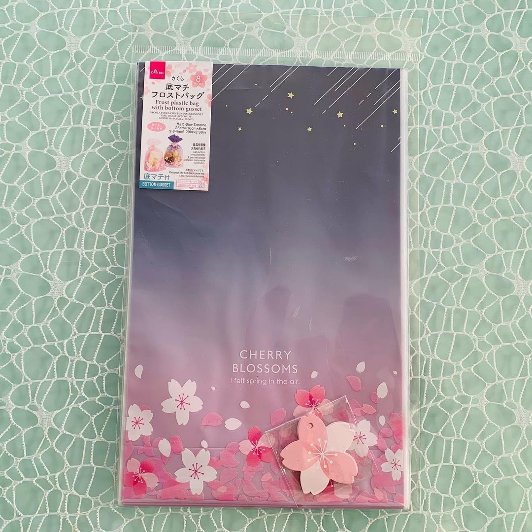 投稿者の@snow_j_manさんが購入したのは、さくら模様のフロストバッグ(100円)。主にラッピングに使うのですが、 底にマチがついているので見た目以上に収納力があります。