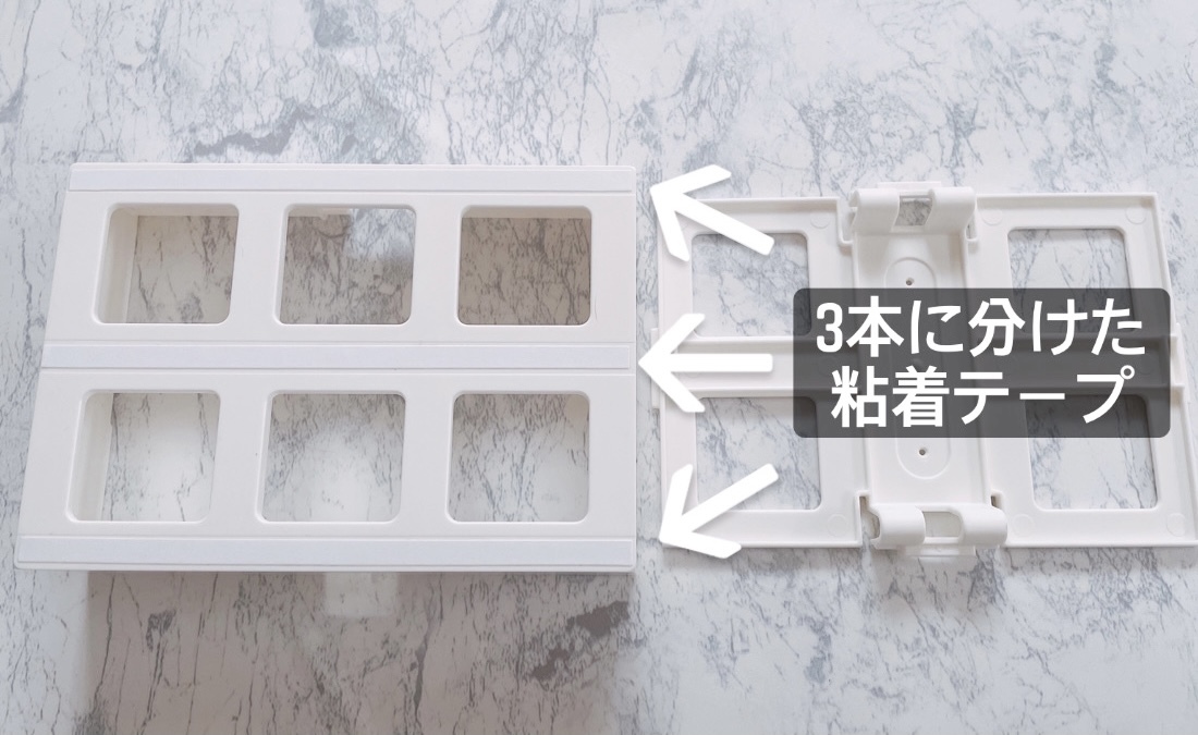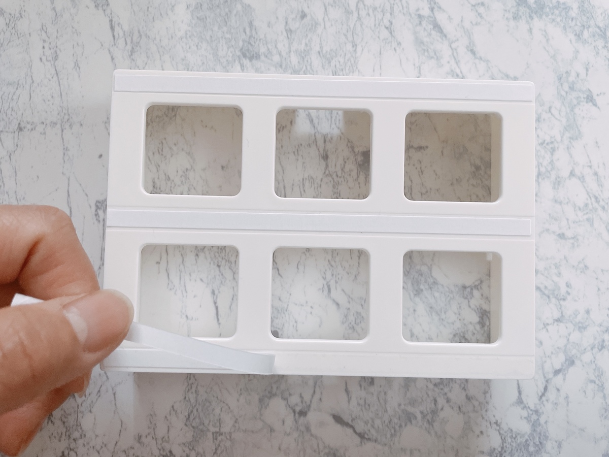 両面テープが3本に分かれるようになっているので、破けないように注意しながら3等分にし、本体の溝部分に両面テープの片面のはくり紙をはがして貼り付けます。