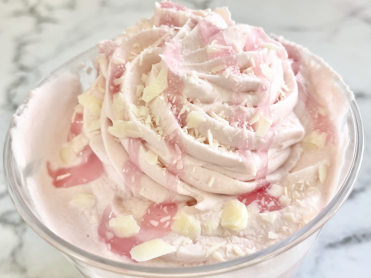 さくらミルクプリンに、さくらホイップクリームがたっぷりと絞られ、さくらソースとホワイトチョコフレークがトッピングされています。