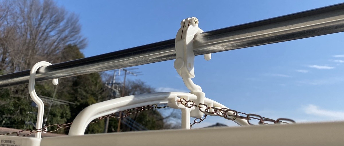 回転止めフックがついており、風の強い日でも壁に当たることなく快適に干せます。回転止めフックは左右のどちらにも付けられます。ストッパーも搭載されているので、横ずれを予防することも可能です。