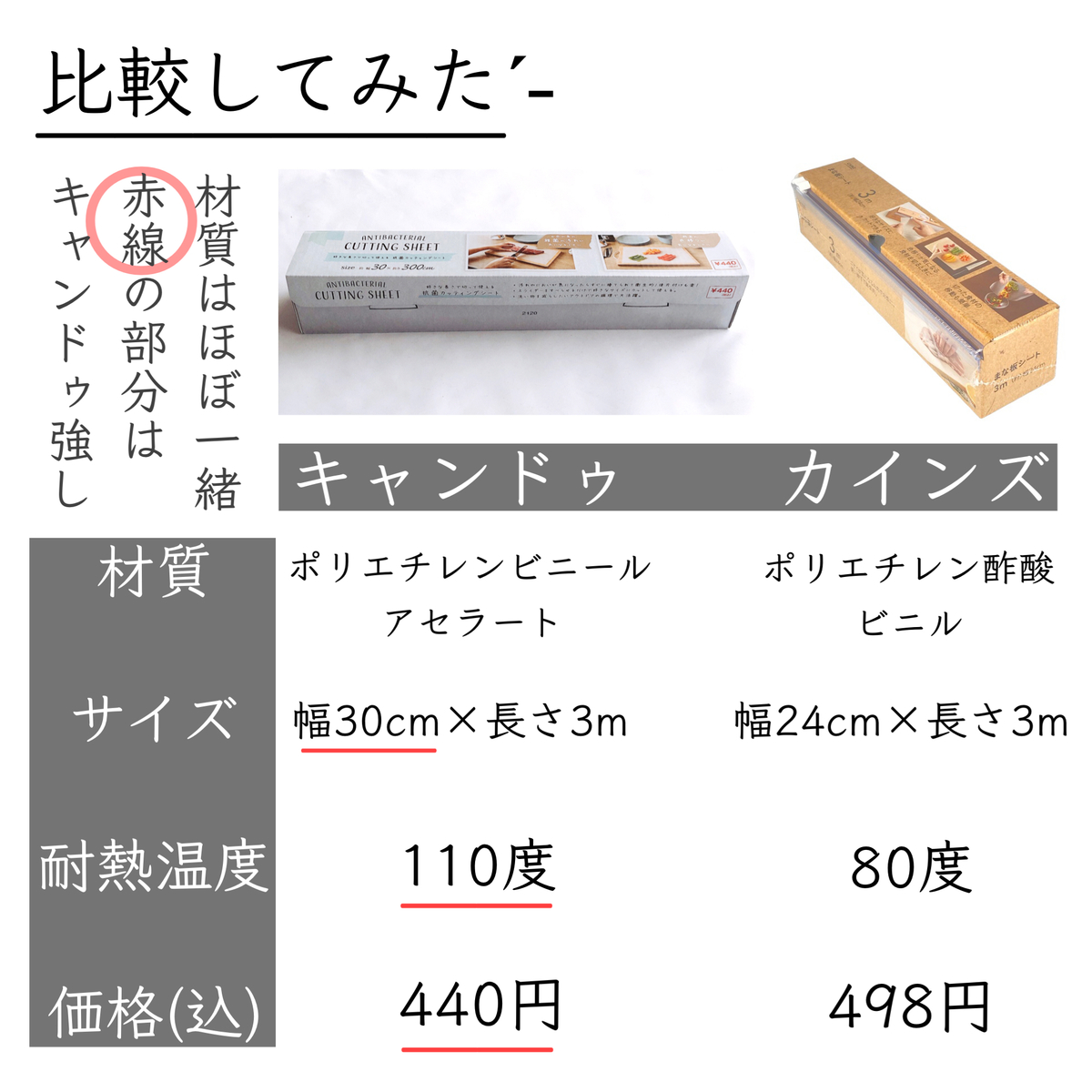赤線の部分(幅・耐熱温度・価格)が、キャンドゥの方が優れていると感じました! キャンドゥの抗菌カッティングシートは、440円(税込)ですが、個人的には「コスパ最高」だと思いました。