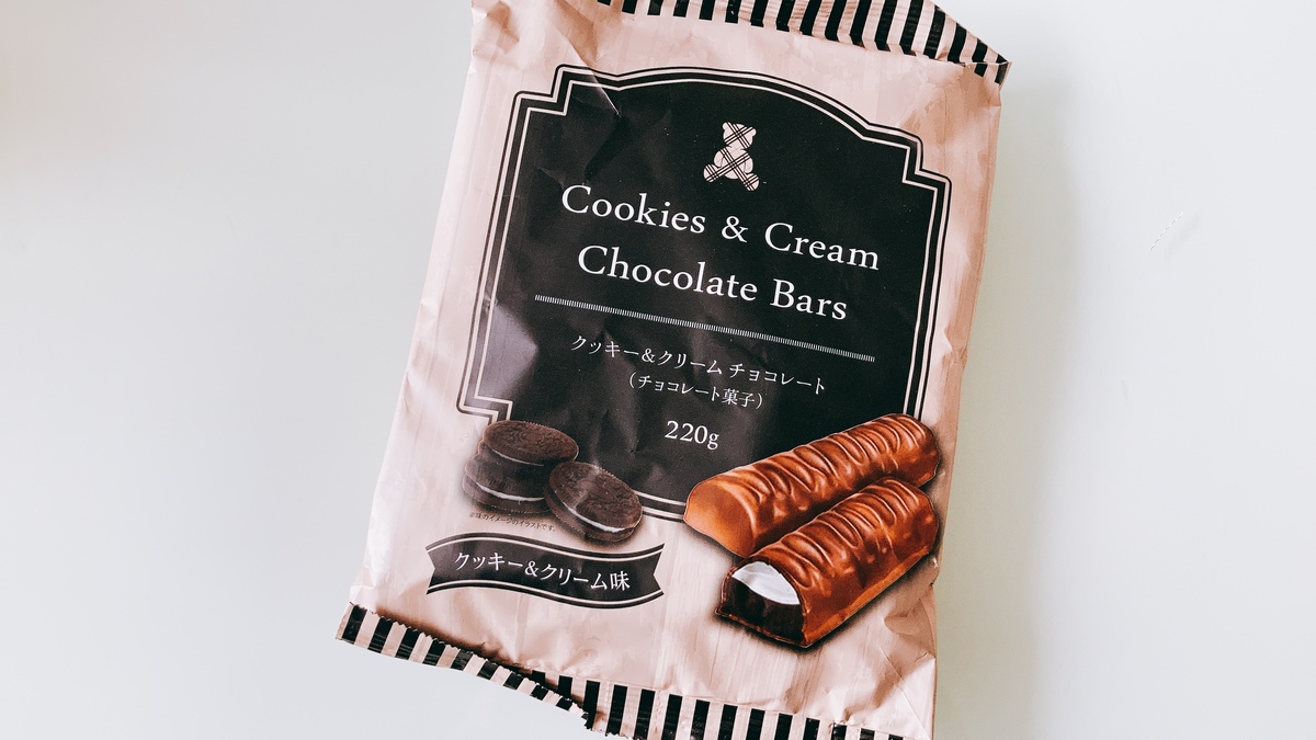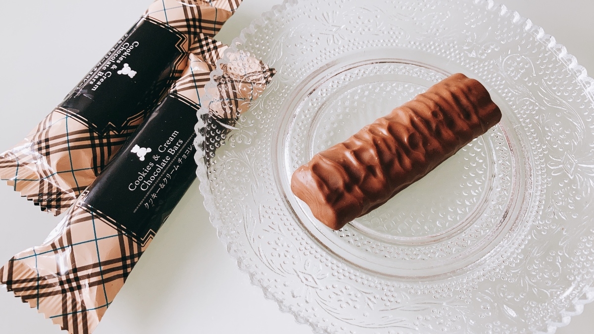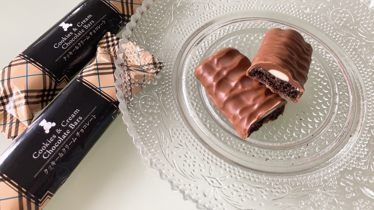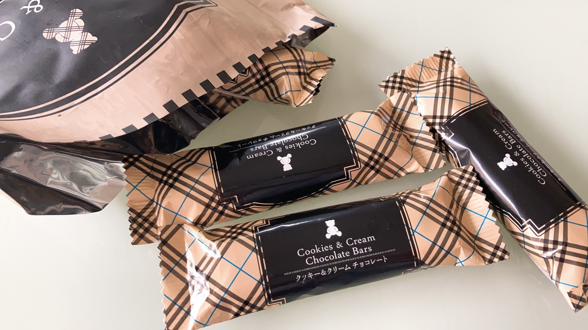 こちらはクッキー&クリームチョコレートバー268円(税込)です。このチェック柄のくまちゃんが何とも可愛らしくて目を引くパッケージ、ついパケ買いです。