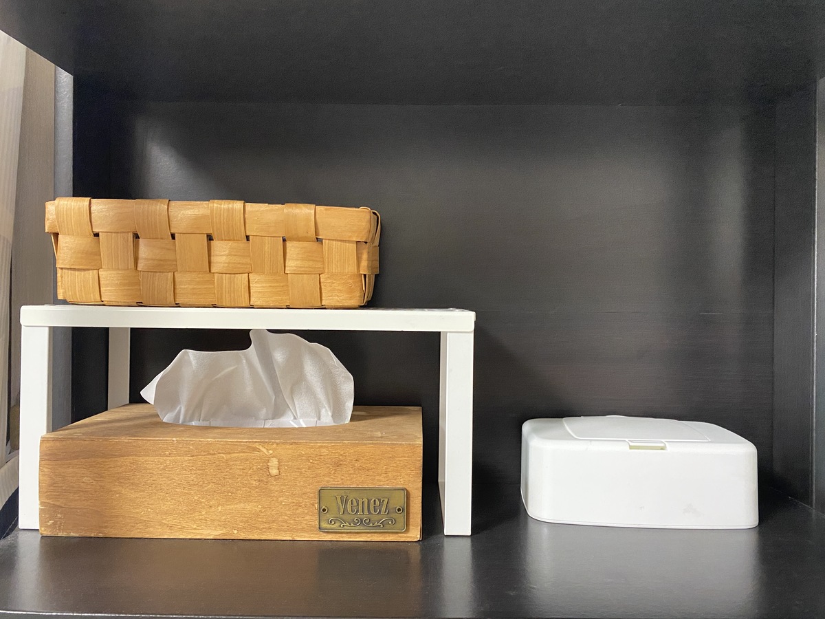 100均の箱や無印良品のファイルボックスでさらに細かく仕切れば、収納棚として使いやすくなりますよ♪