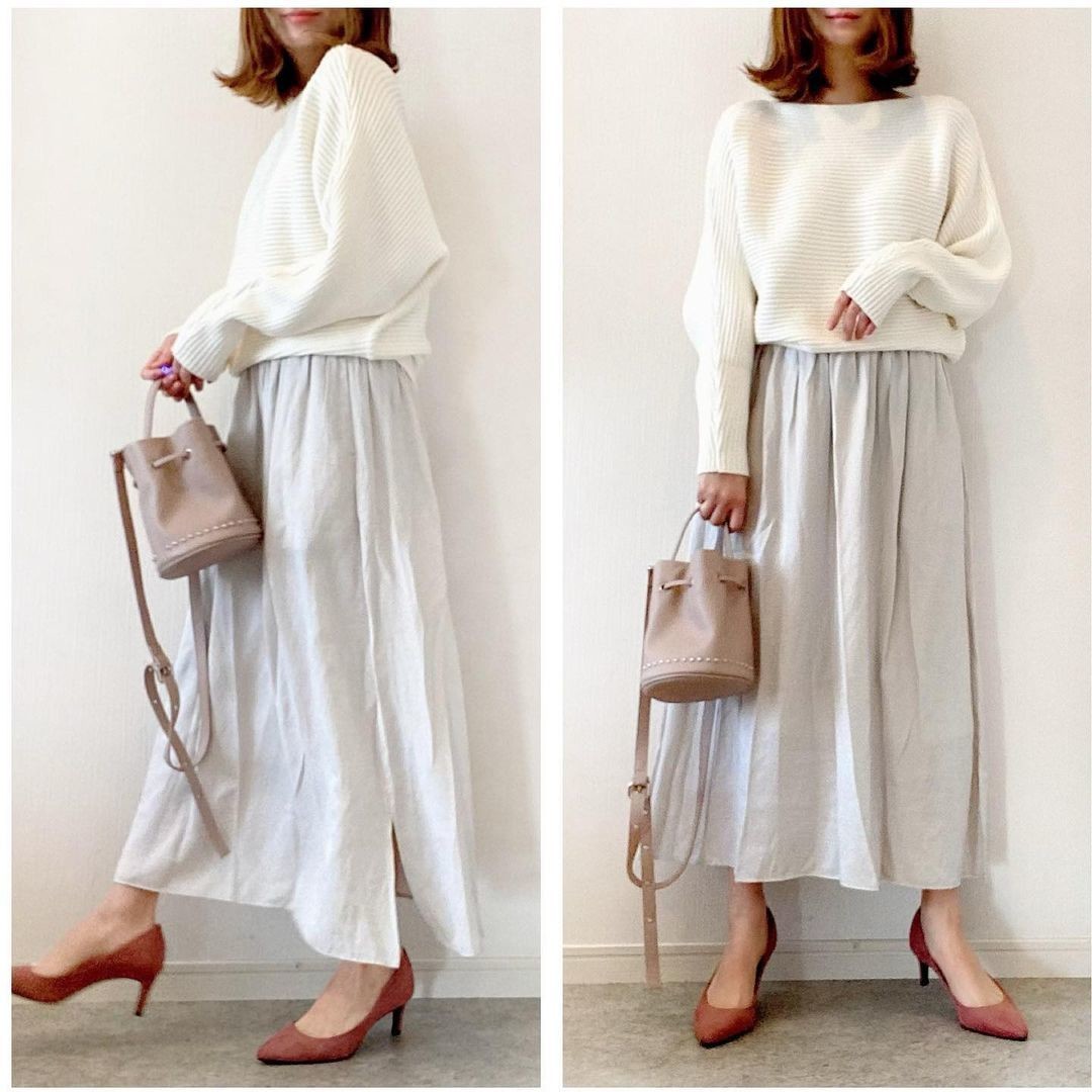 一つ前のコーディネートのスカートを、ナチュラルカラーにチェンジ。