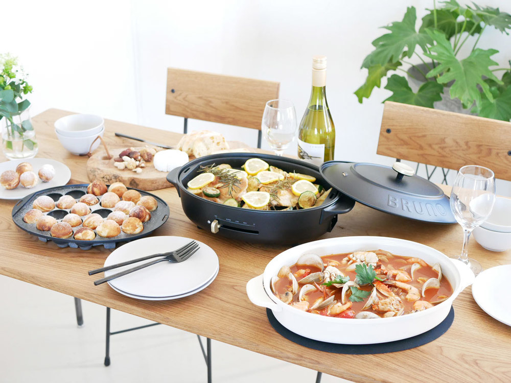「BRUNO オーバルホットプレート」は、焼肉やお鍋はもちろん、すき焼きや煮込みハンバーグなどちょっとした汁気のある物やたこ焼きもこれ一つでOK。 深鍋は直火も可能、付属のシリコンマット付きでアツアツのお鍋を置きながら他のプレートで2品目のお料理も作れたりと、一人のじっくりご飯から、お友達とのパーティまで、スムーズに演出してくれます。