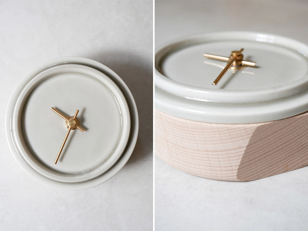 「ミニクロック pot 」は岐阜県多治見市の職人が一つ一つ丁寧に作られた杉浦製陶製で本体はブナの木を採用。アイキャッチだけではなく指先でも素材の違いを楽しめます。繊細な感覚を毎日楽しめる置き時計です。