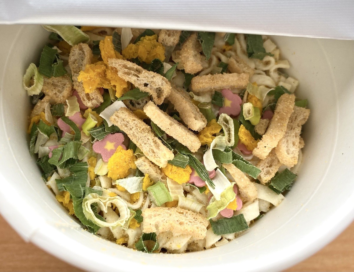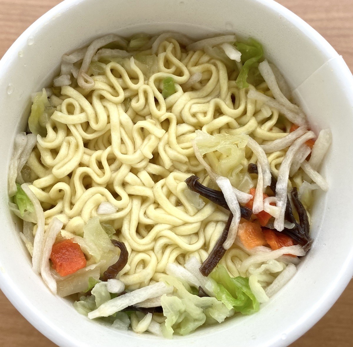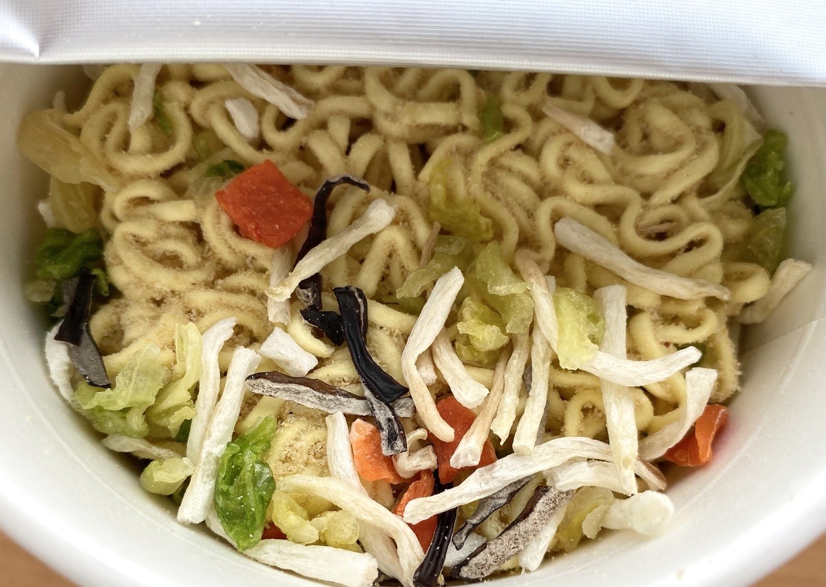 キャベツやニンジン、もやし、キクラゲなど小ぶりながら薬味が豊富に入っており、食べ応えがあります。筆者は、小さく切ったほうれん草をトッピングして、アレンジを楽しみました。