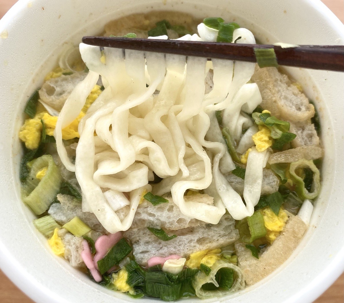 スープは出汁が効いていて、とにかく旨味が詰まっていました。麺は平たい太麺で、スープの味をたっぷり吸収してくれます。細かく切られたふっくらとした油揚げが、味のアクセントとして活躍してくれています。