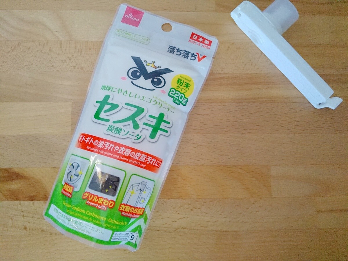 悩んだ結果、一度に使う量が多い過炭酸ナトリウムにこちらの袋用クリップを、少量だけ使いたいセスキ炭酸ソーダには落ち落ちVの袋キャップを使用することにしました。