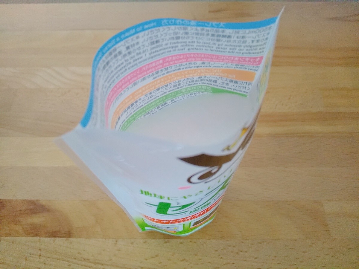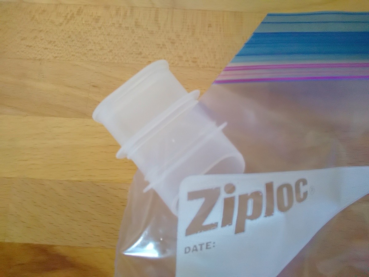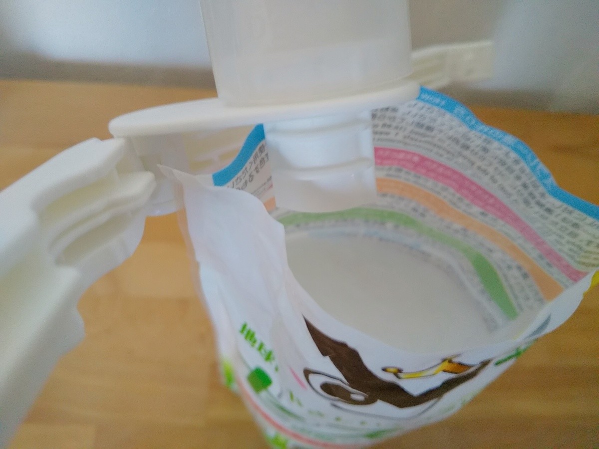 クリップを開いたら、注ぎ口を袋の中に入れます。