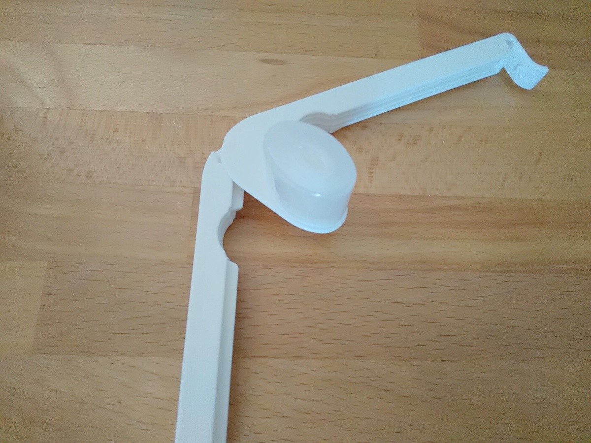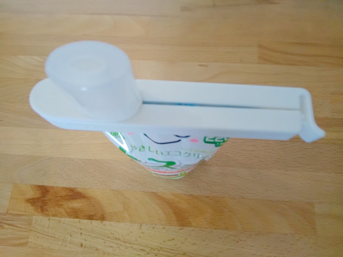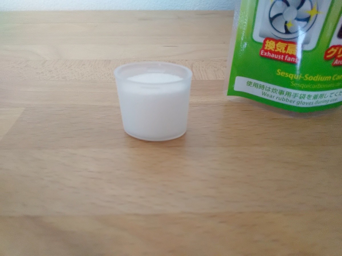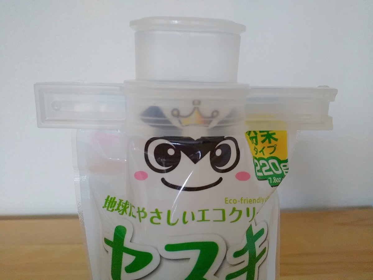 取り付け方は簡単で、クリップをパチリと閉じるだけ。 落ち落ちVのセスキ炭酸ソーダに取り付けてみました。