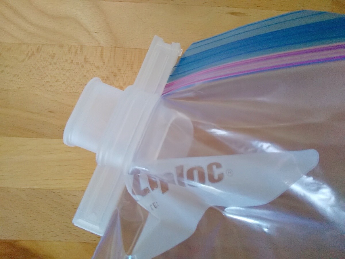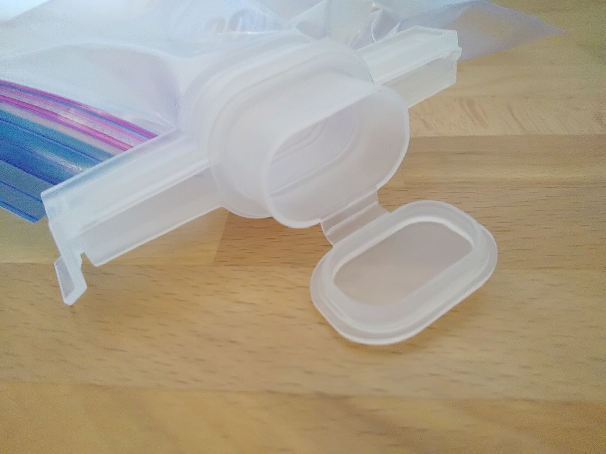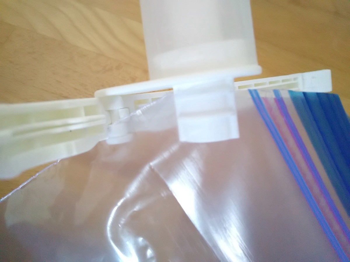 ②クリップをガバッと開き、注ぎ口パーツを袋の中に入れます。