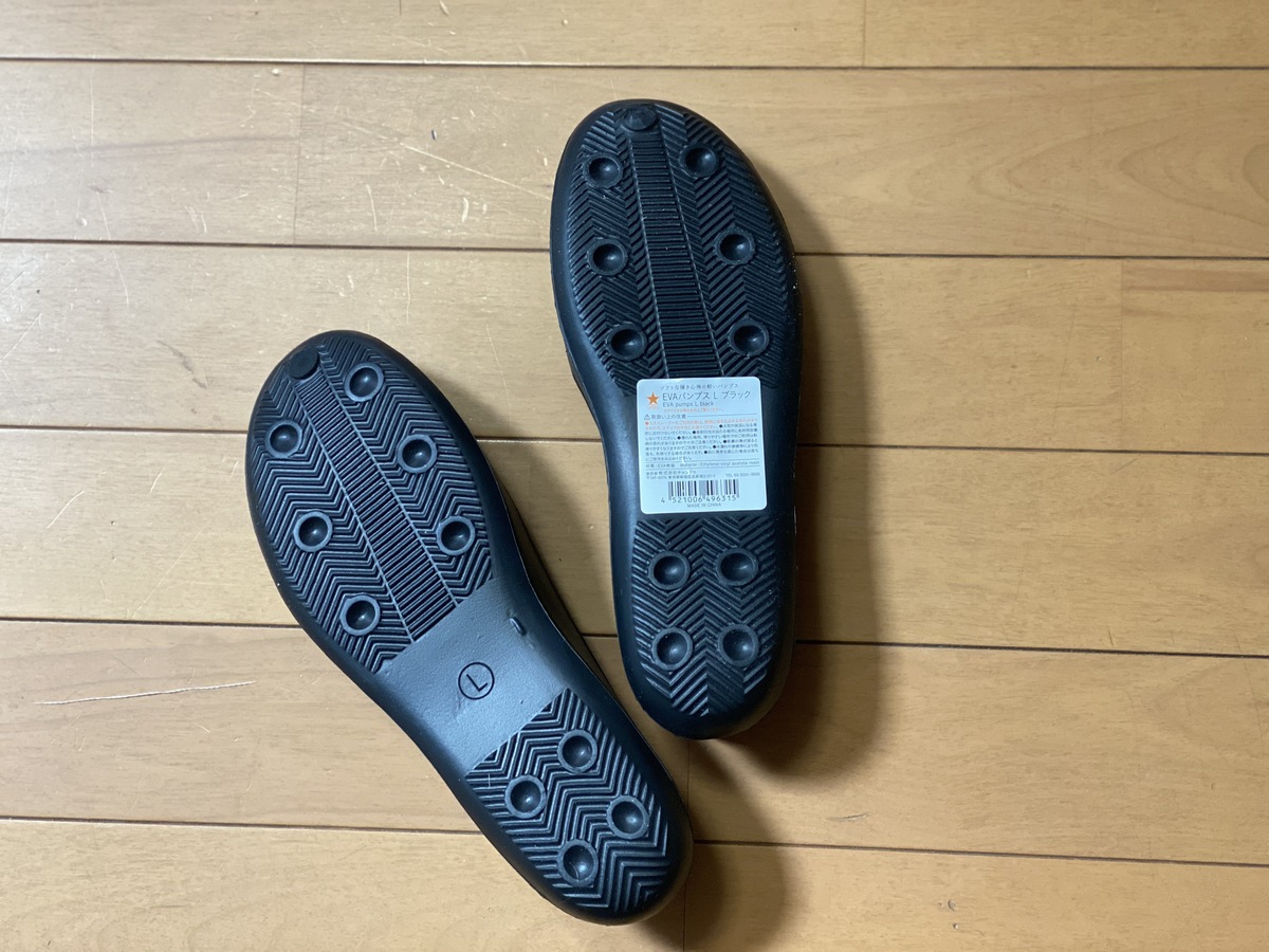 そこで、靴の代わりにEVAパンプスを置いています。靴底に厚みがあるので、災害後の荒れた家の中を歩く程度なら安心です。