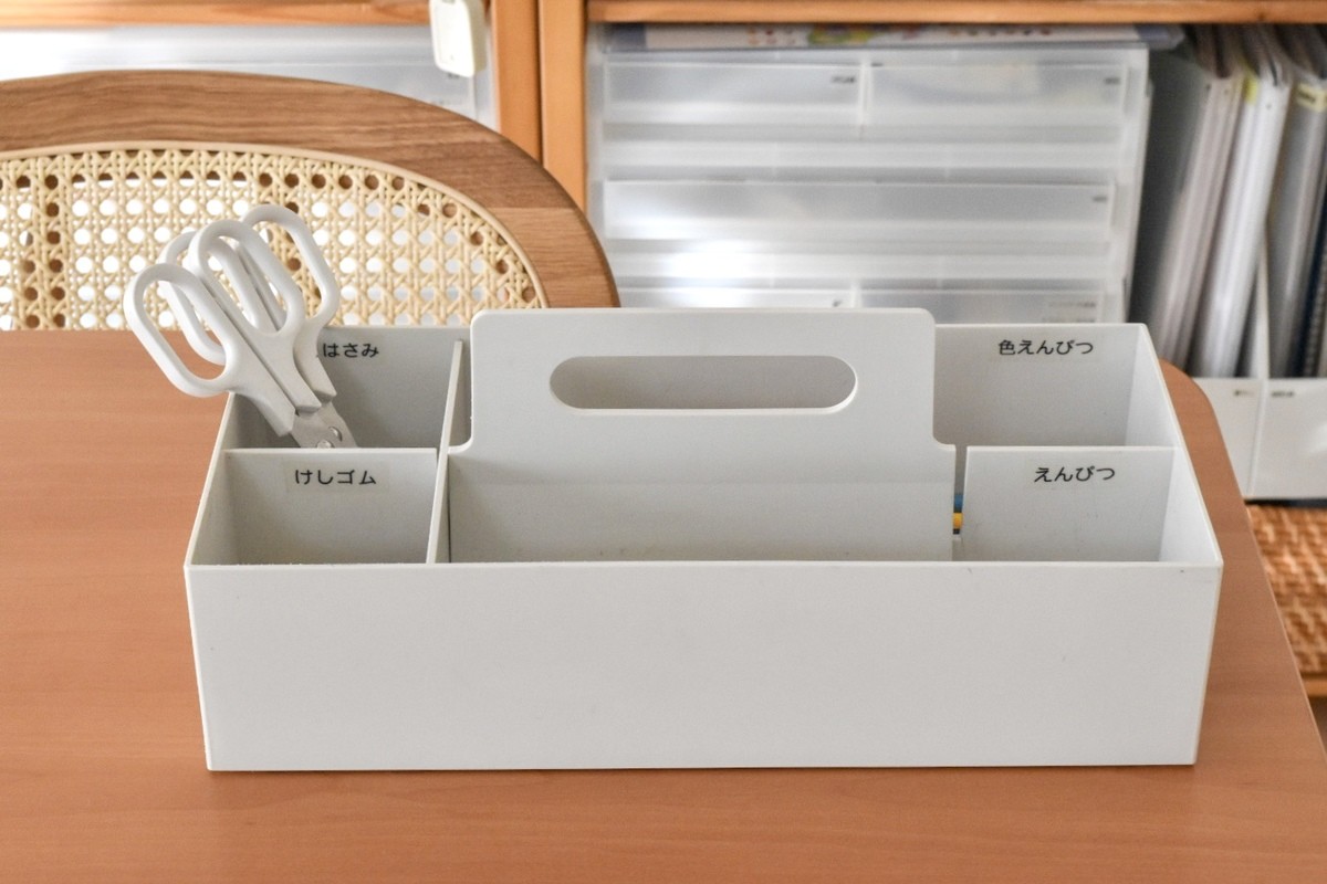 また、持ち手がついているので運ぶ際もラク。勉強する時は机の上にボックスを出し、終わったらぽいっと文房具を入れてダイニング脇に戻すだけです。動きも少なく子供でも簡単に片付けられます。