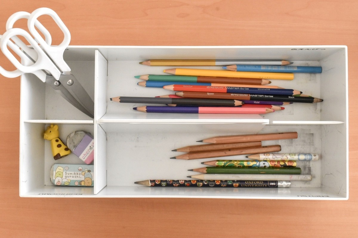 わが家は仕切りを一つ外して、子どもがよく使うえんぴつ、色鉛筆、消しゴム、ハサミ、定規を収納していますが、仕切りを全て使えばたまに使う三角定規やコンパス、色ペンなども収納できます。