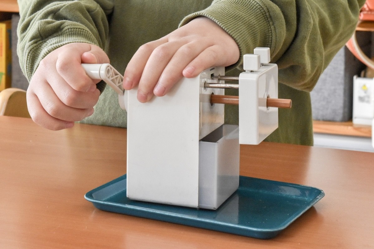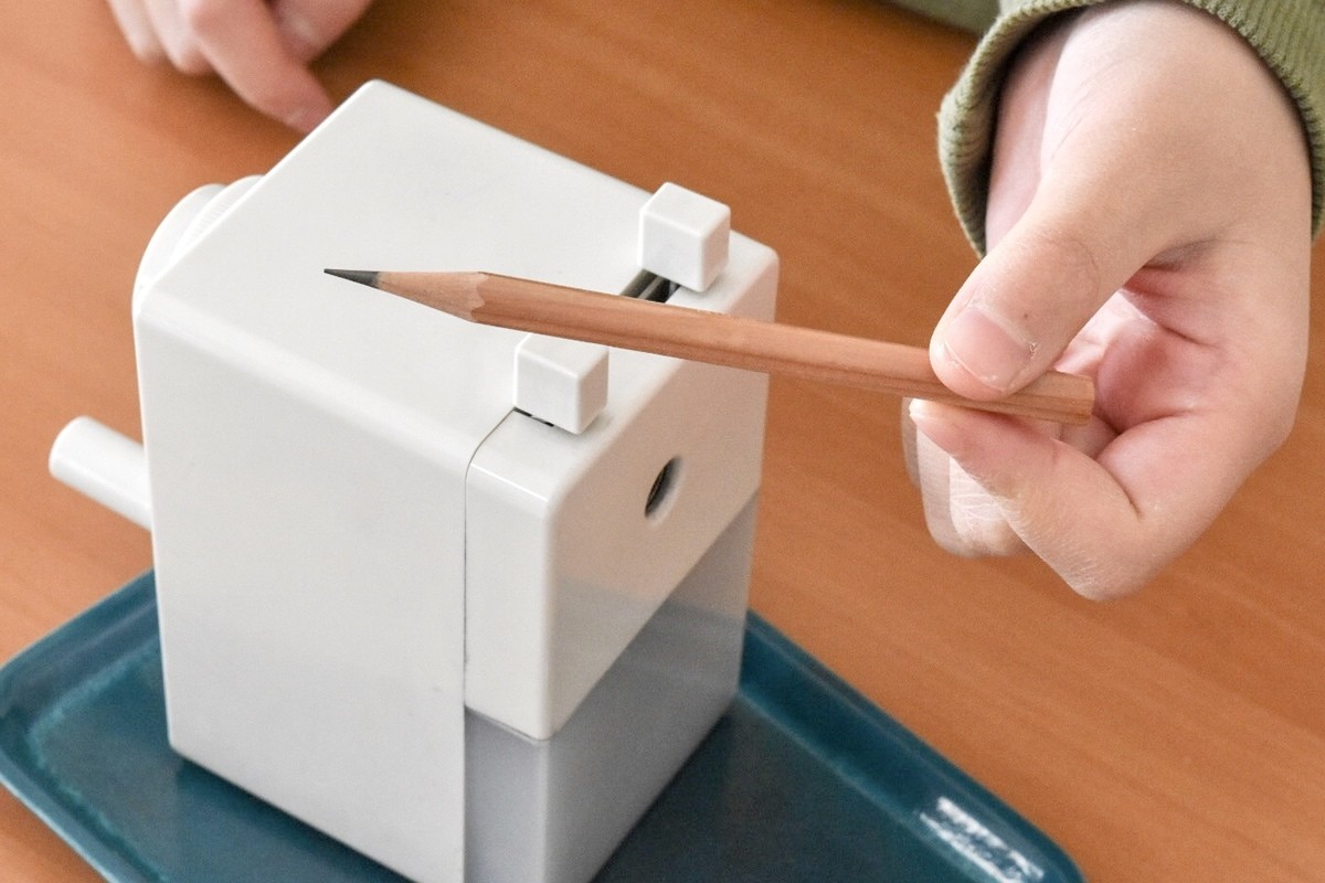 無印良品の手動式鉛筆削りは大と小が販売されていますが、大の方が安定感があり子どもも扱いやすいように感じます。