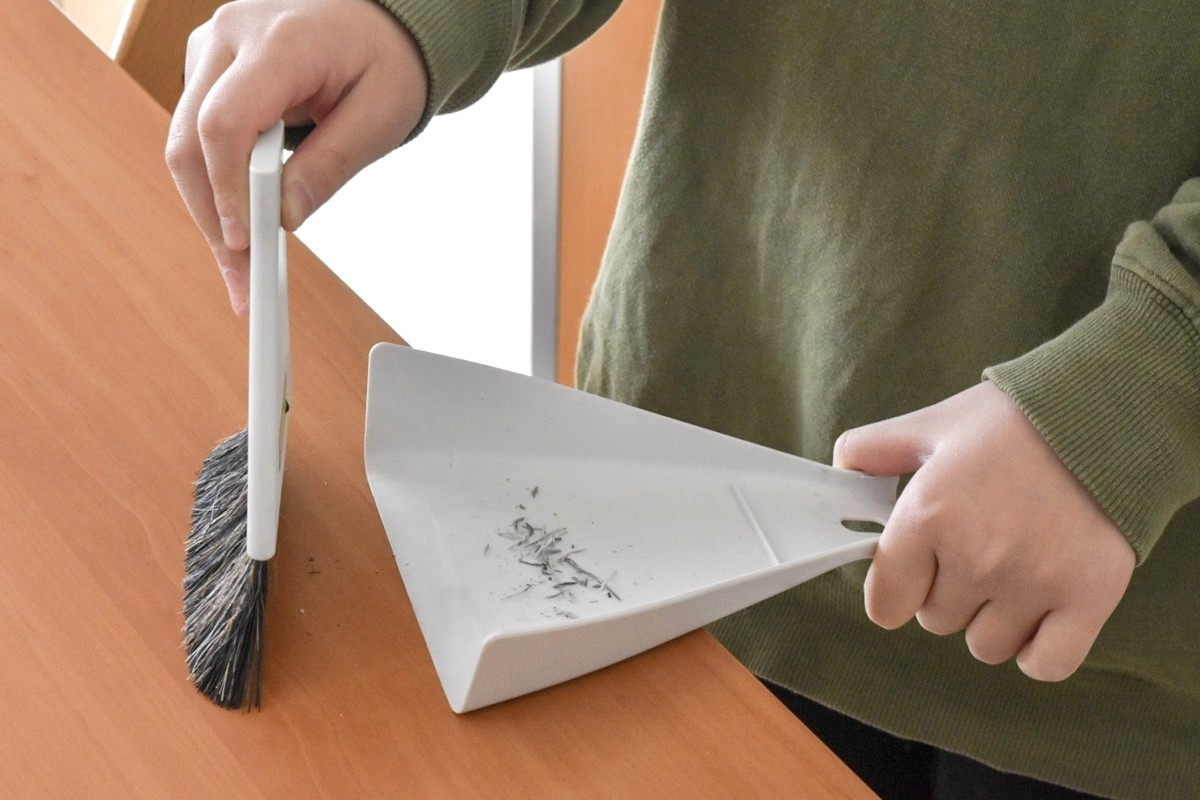 卓上ほうきは、ダイニングで勉強する際に出る消しカスを掃くのに重宝しています。
