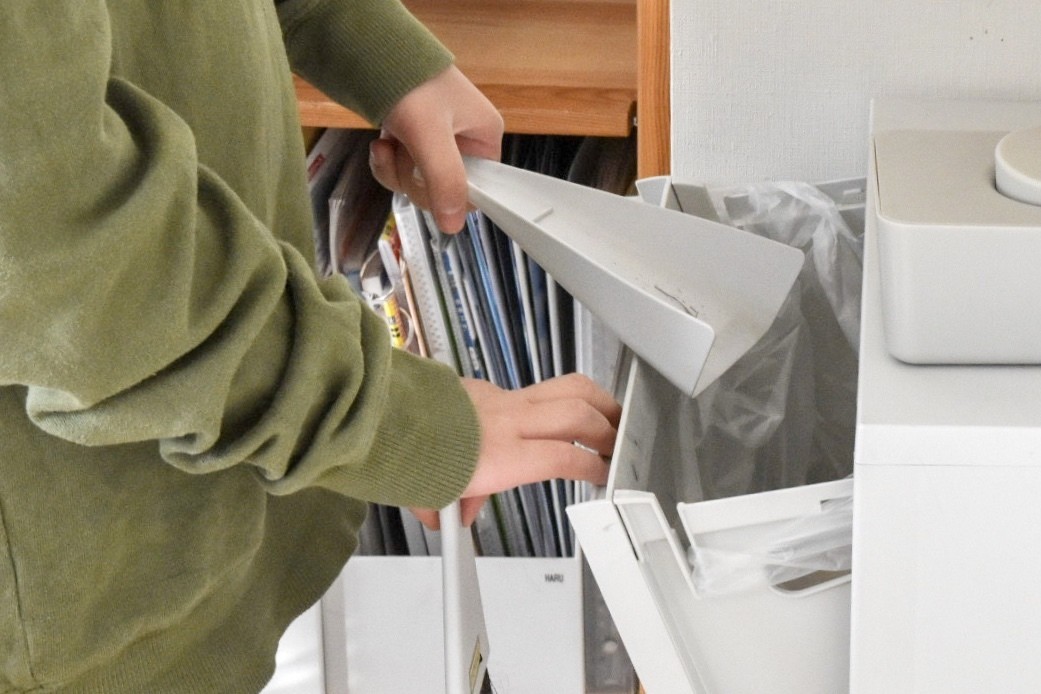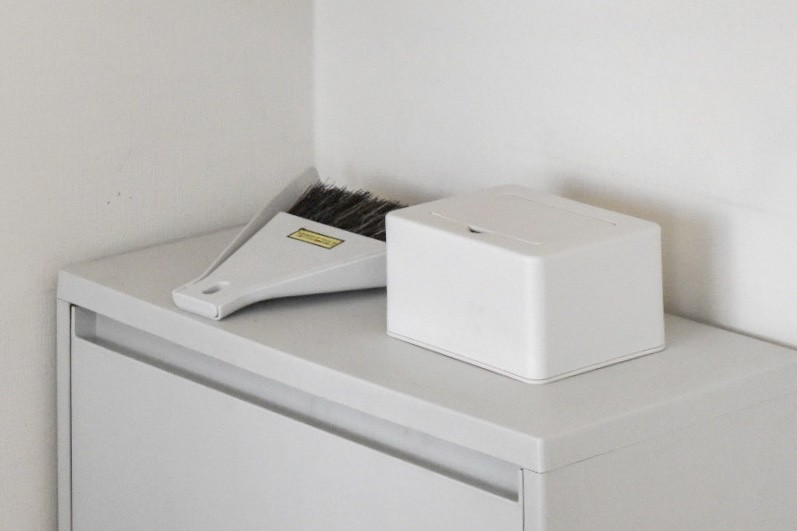 大きなゴミ箱を置けない場合は、コンパクトサイズのゴミ箱をほうきと一緒に置いておくといいですよ。