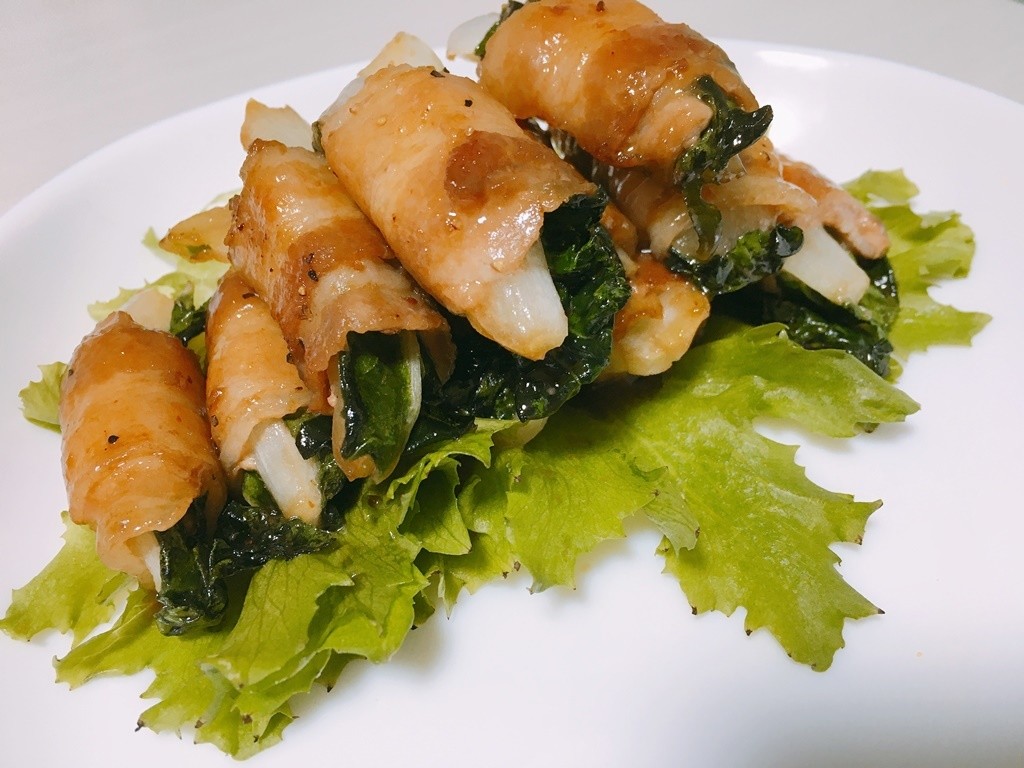 細切りにしたパクチョイを豚肉で巻いて、塩コショウをしたら軽く小麦粉を振りかけてフライパンで焼いたら、