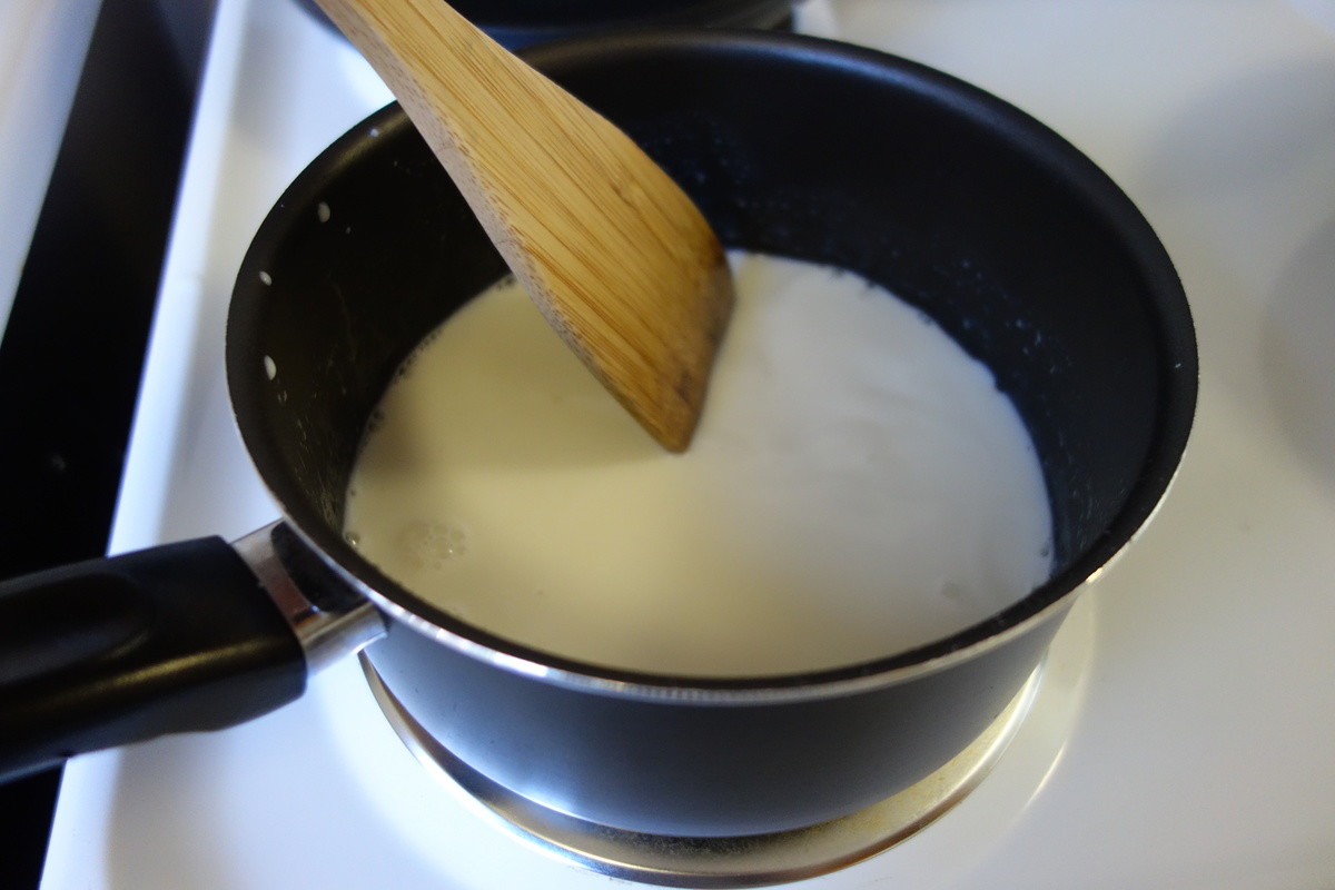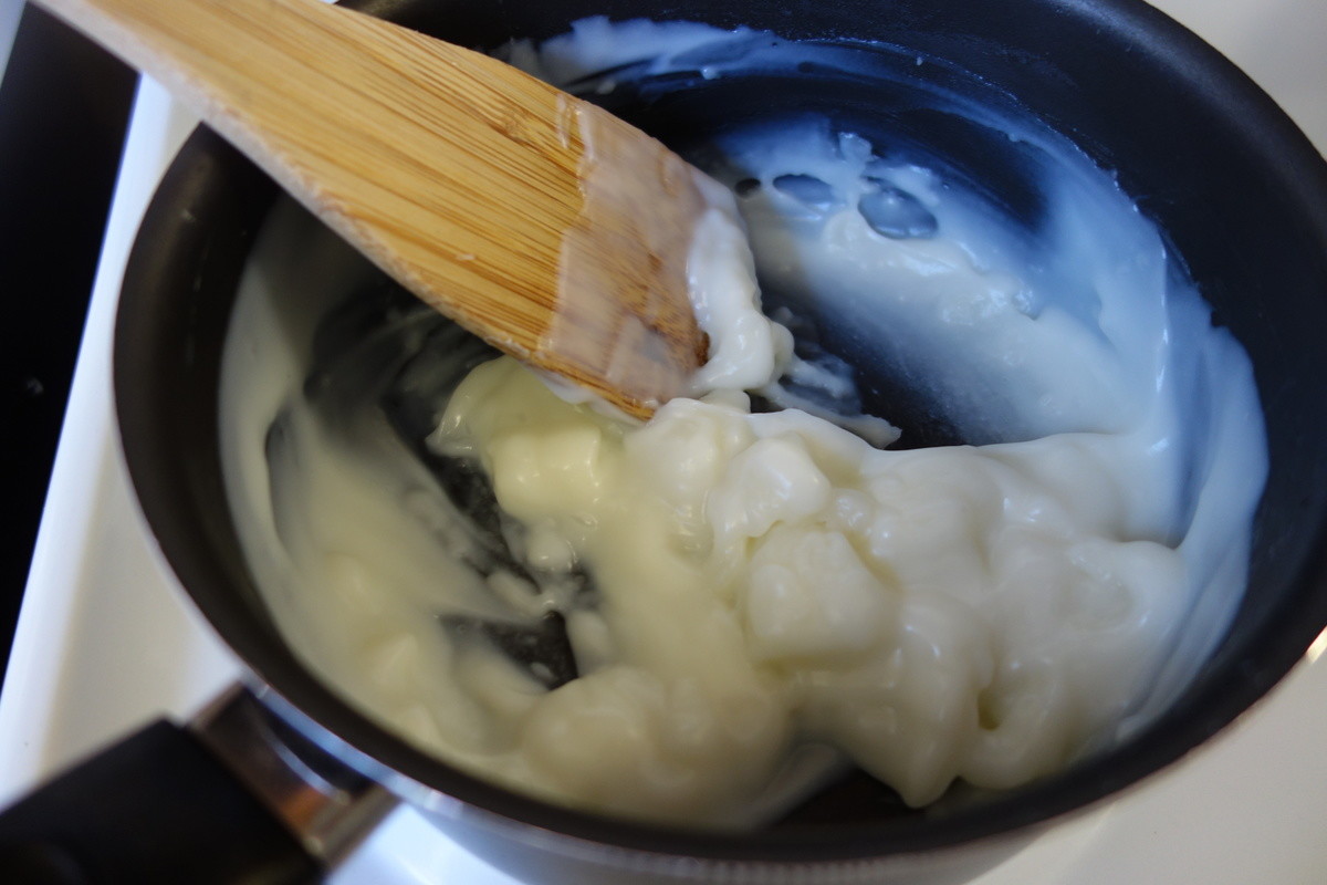 ミルク餅作り方①材料を鍋に入れて弱火で混ぜる