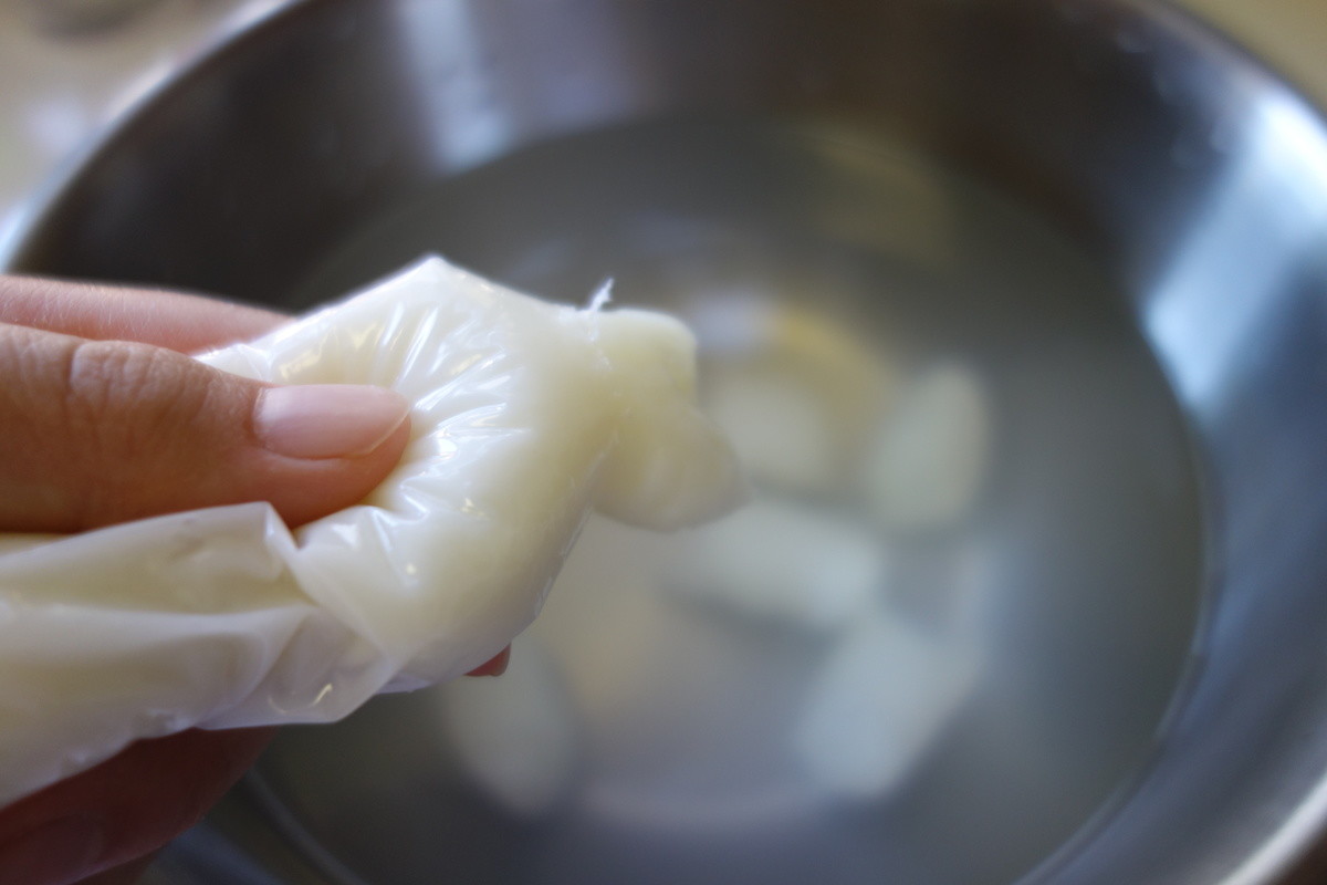 搾り袋に生地を入れ、一口サイズに絞り出します。絞り出した生地は、水を張ったボウルに落として冷やします。