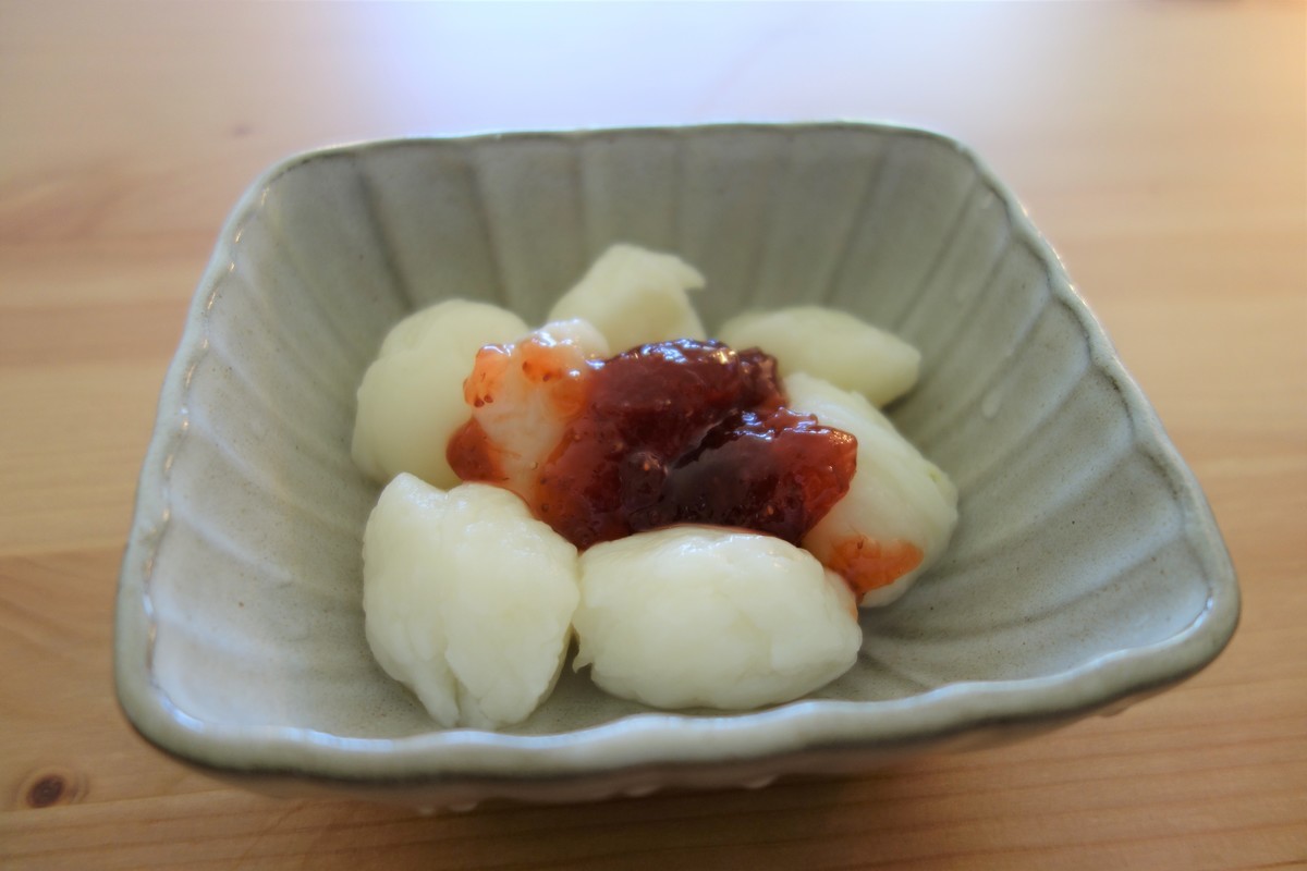 ミルク餅にいちごジャムをのせてみたら、一番子どもが好きそうな味でした。