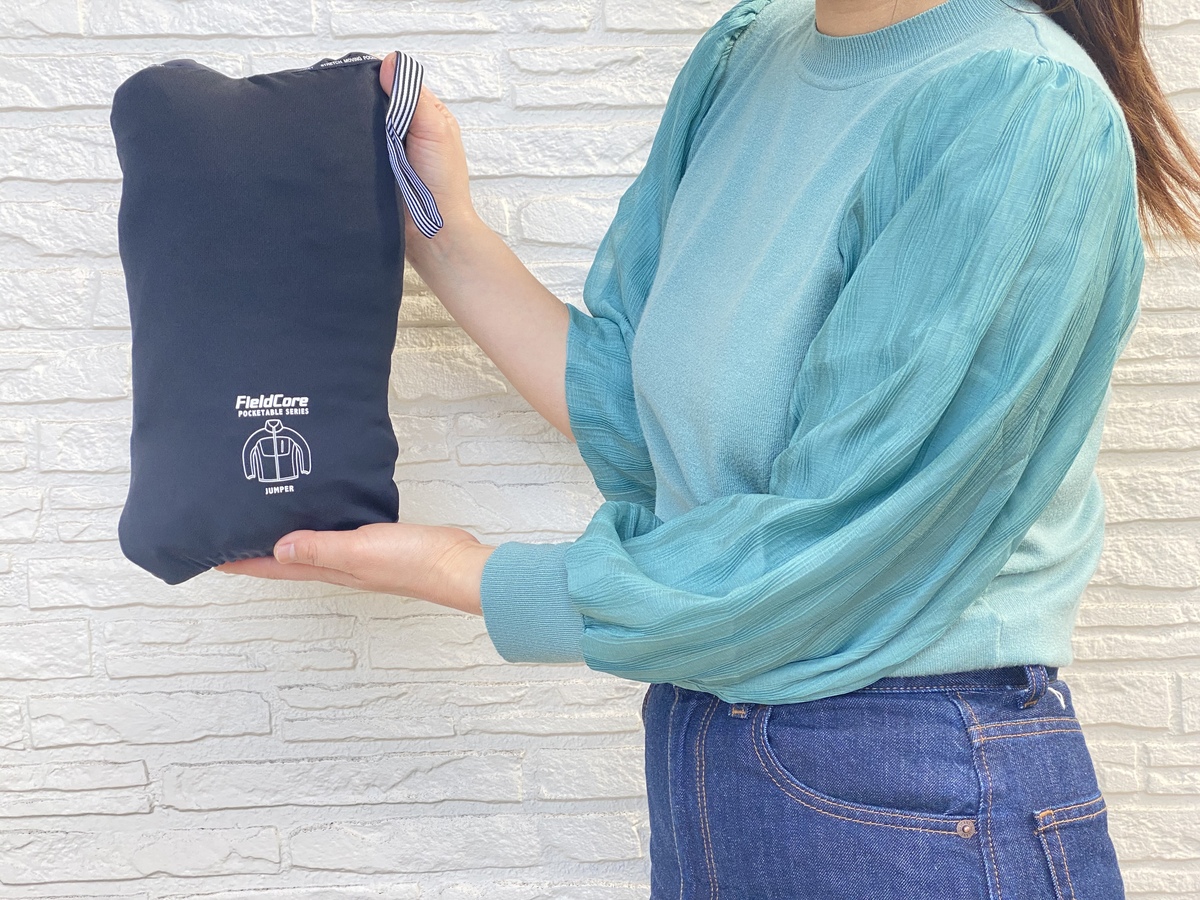 「フィールドコア AERO STRETCH ブルゾン」はポケッダブル使用なので、500mlペットボトル3本ほどのサイズにコンパクトに収納できるんです。