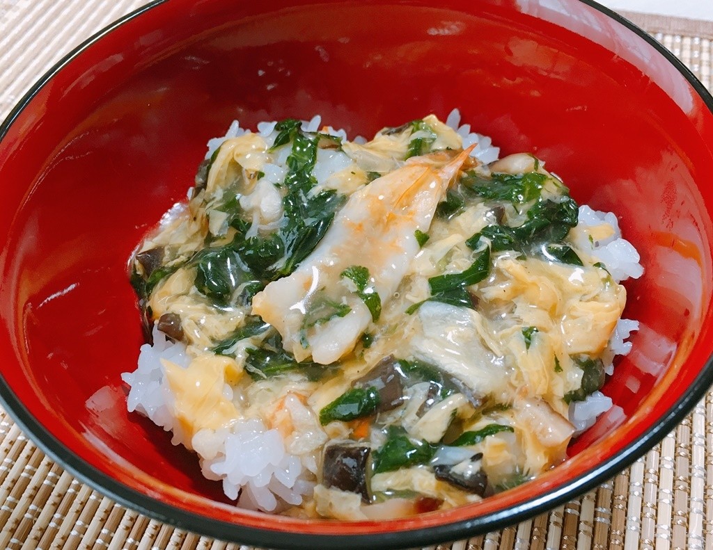 チキン・ポーク・ほたてのエキスをあんかけでぎゅっと閉じ込めた、おいしい中華丼でした。お店で食べる中華丼に引けを取りません。