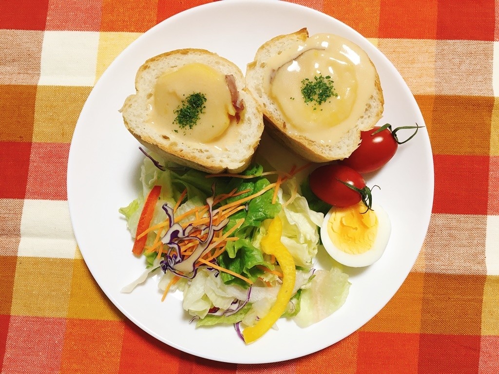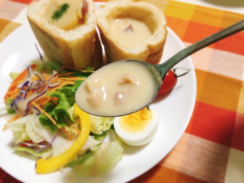 フランスパンにかぽっとフタをしているのがそのさつまいもです。ベーコンもゴロゴロ入っていてとてもおいしかったですよ。