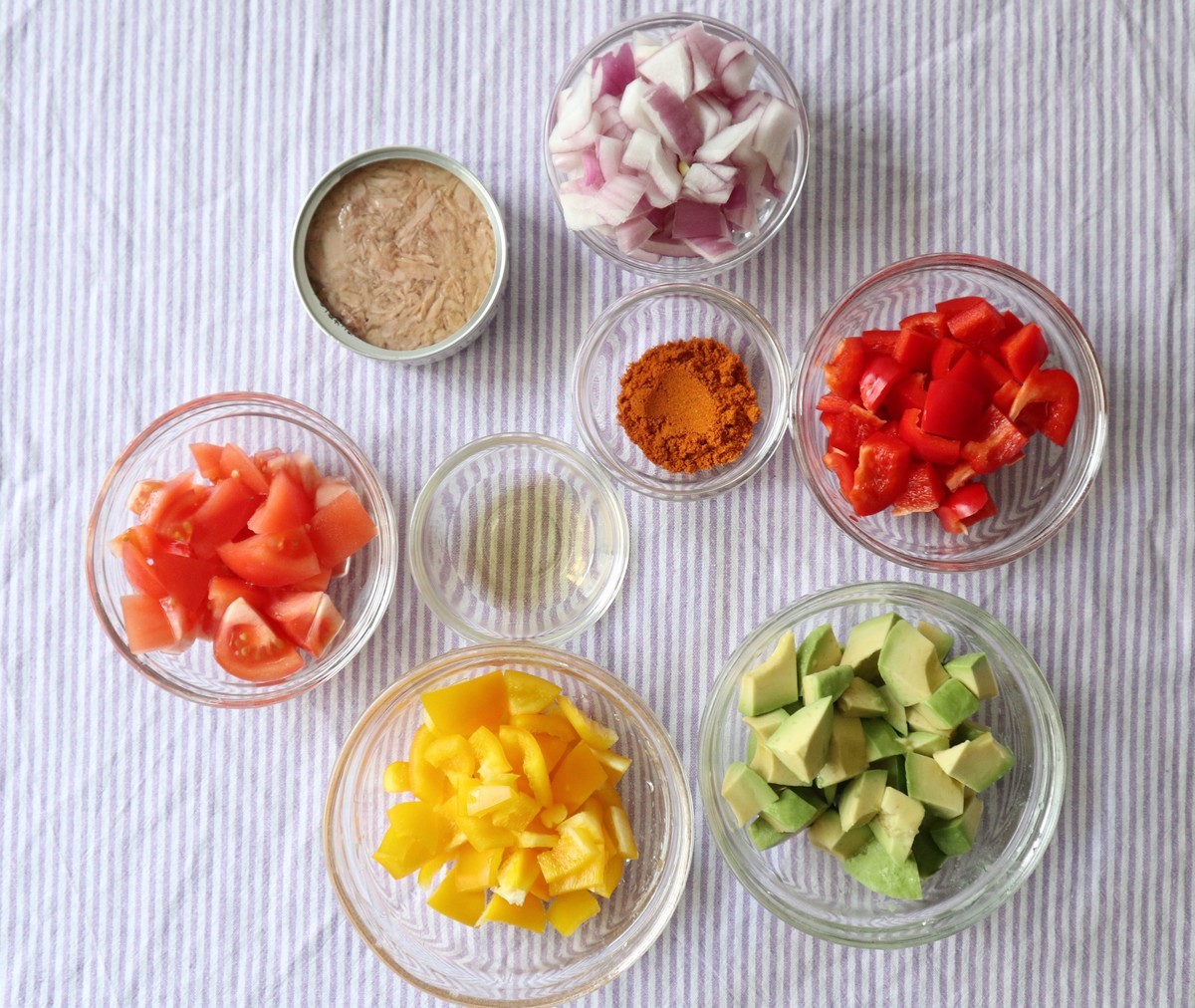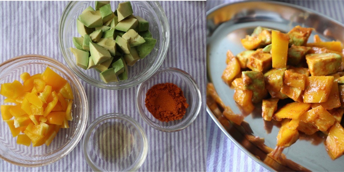 アボカド(1/2個)とパプリカ(小1個)、アチャール大さじ1、酢大さじ1を和えたら完成です。