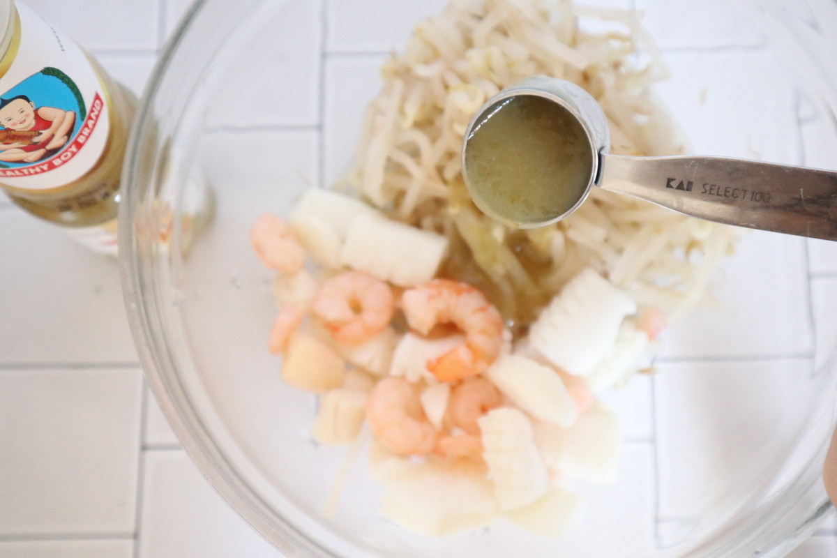 シーフードミックスは解凍して、火が通るまでゆでる。