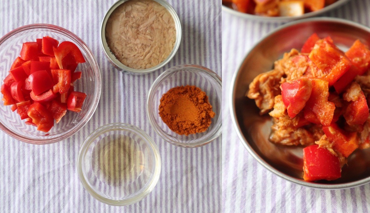パプリカ(小1個)は、ダイス状に切って、ツナ缶、アチャール大さじ1、酢大さじ1と混ぜれば完成です。