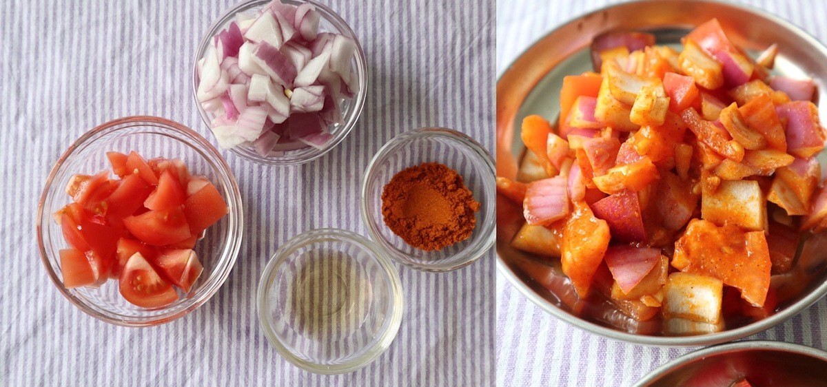 トマト(1個)と紫玉ねぎ(1/2個)、は、ダイス状に切って、アチャール大さじ1、酢大さじ1と和えたら完成です。