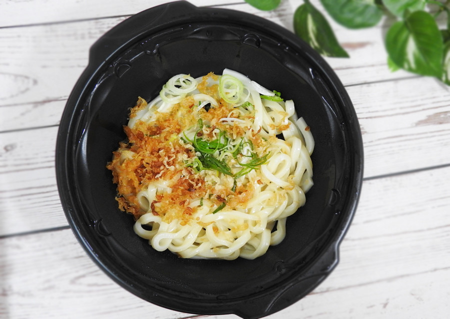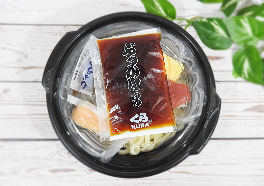 うどんには天かすとネギがかかっていました。くら寿司の商品写真を見ると、天かすがなかったのでこれは嬉しい誤算。添付のぶっかけつゆを入れて食べましたが、濃い目でしたね。夫は平気そうでしたので、あくまでも人によって感じ方が違うといった程度の濃さなのかもしれません。