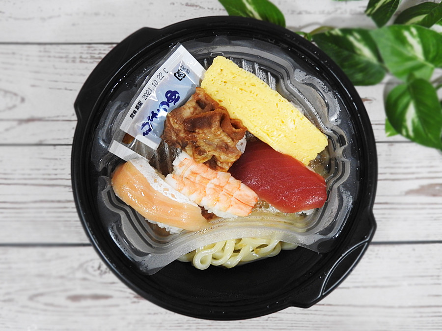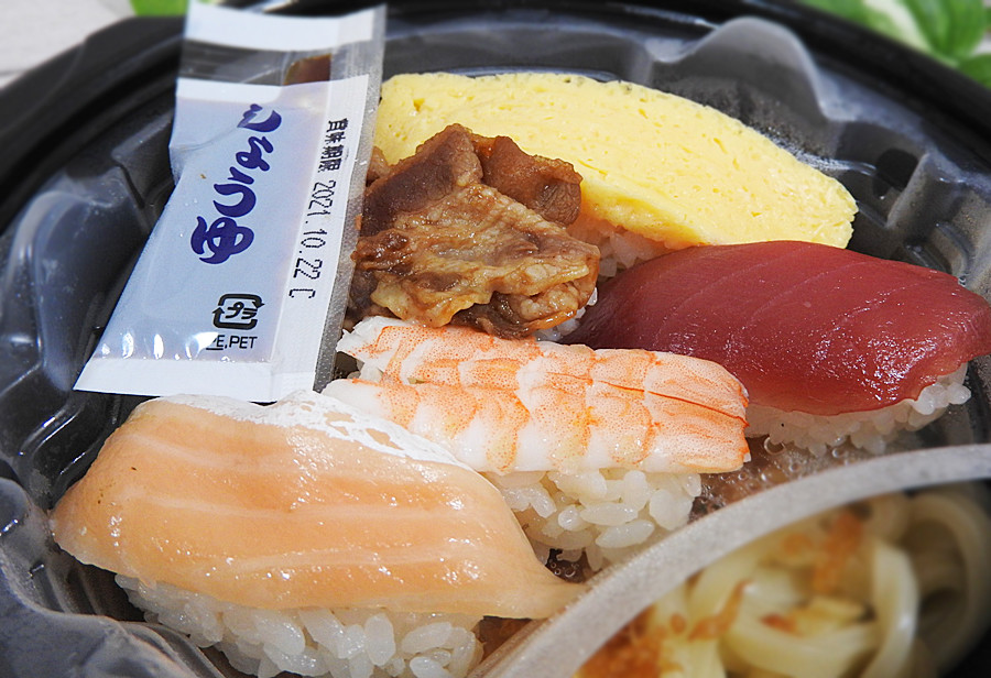 容器上段には寿司5貫下段にはうどんが入っています。うどんのつゆは後掛けですので、持ち帰り時につゆがこぼれる心配はありません。ただし、持ち帰りから時間が経ってしまうと、うどんが固まってしまうのが厄介かも。