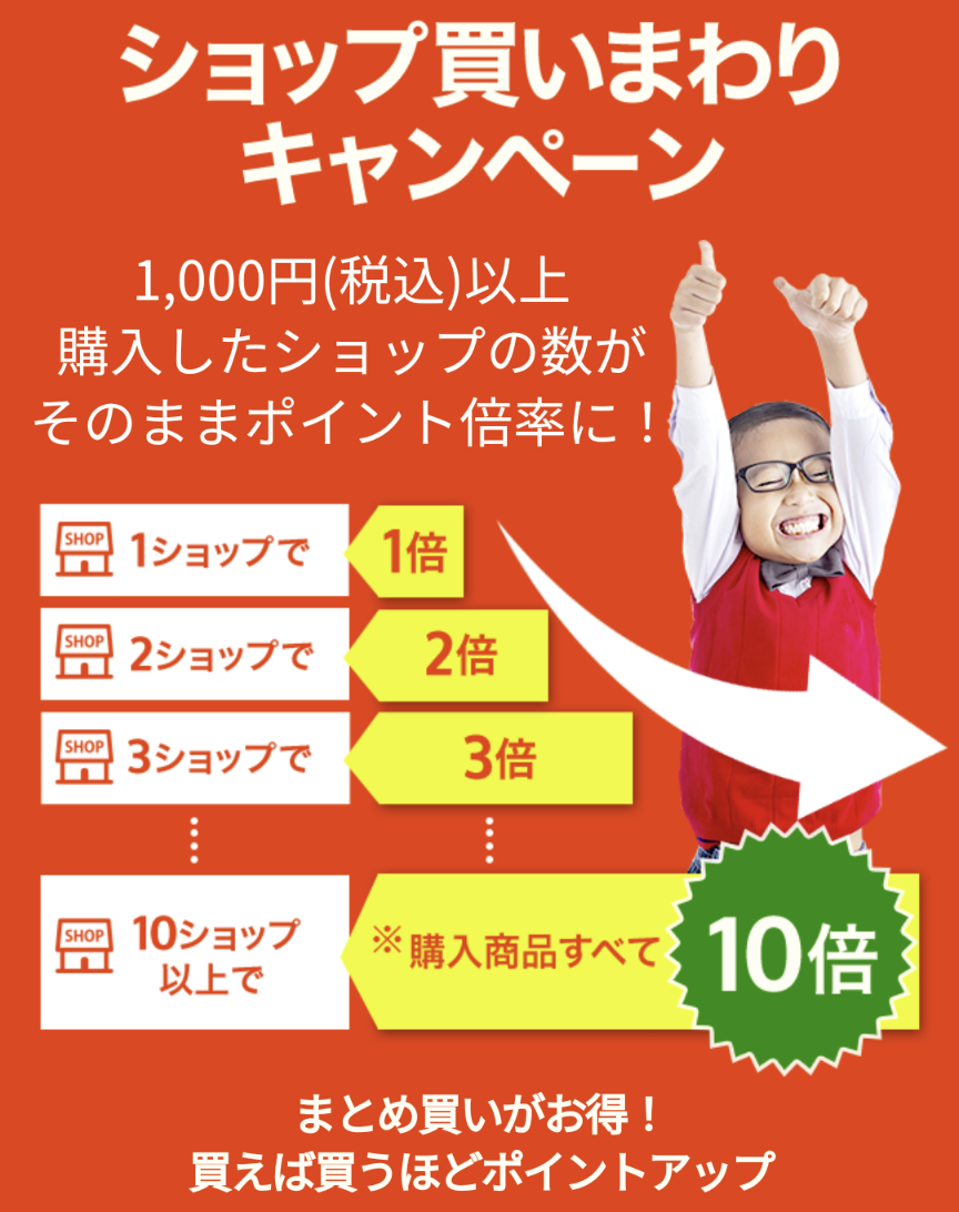 楽天スーパーセールで賢くポイントを溜めるには、「ショップ買いまわりキャンペーン」のエントリーが必須です。 こちらは1,000円(税込)以上の商品を購入したショップの数がそのままポイント倍率になるというお得なキャンペーンです。