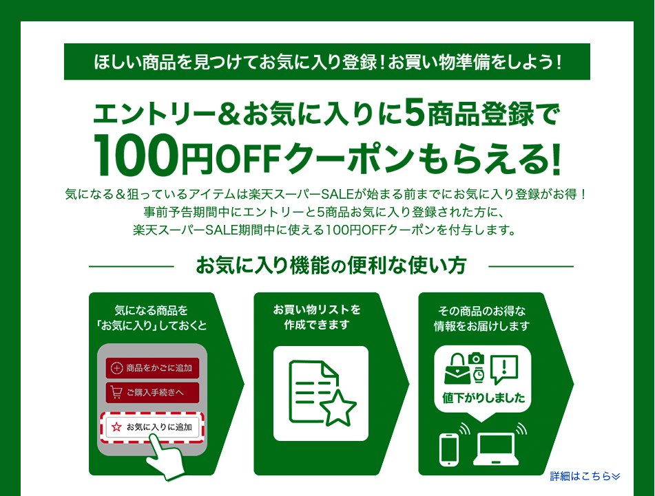 2021年3月1日(月)10:00~2021年3月4日(木)19:59までに、エントリー&お気に入り商品を5つ登録すると100円OFFクーポンがもらえます。 やり方は楽天スーパーセールが始める前に、気になる商品を5つ選んで「お気に入りに追加」をクリックするだけ。